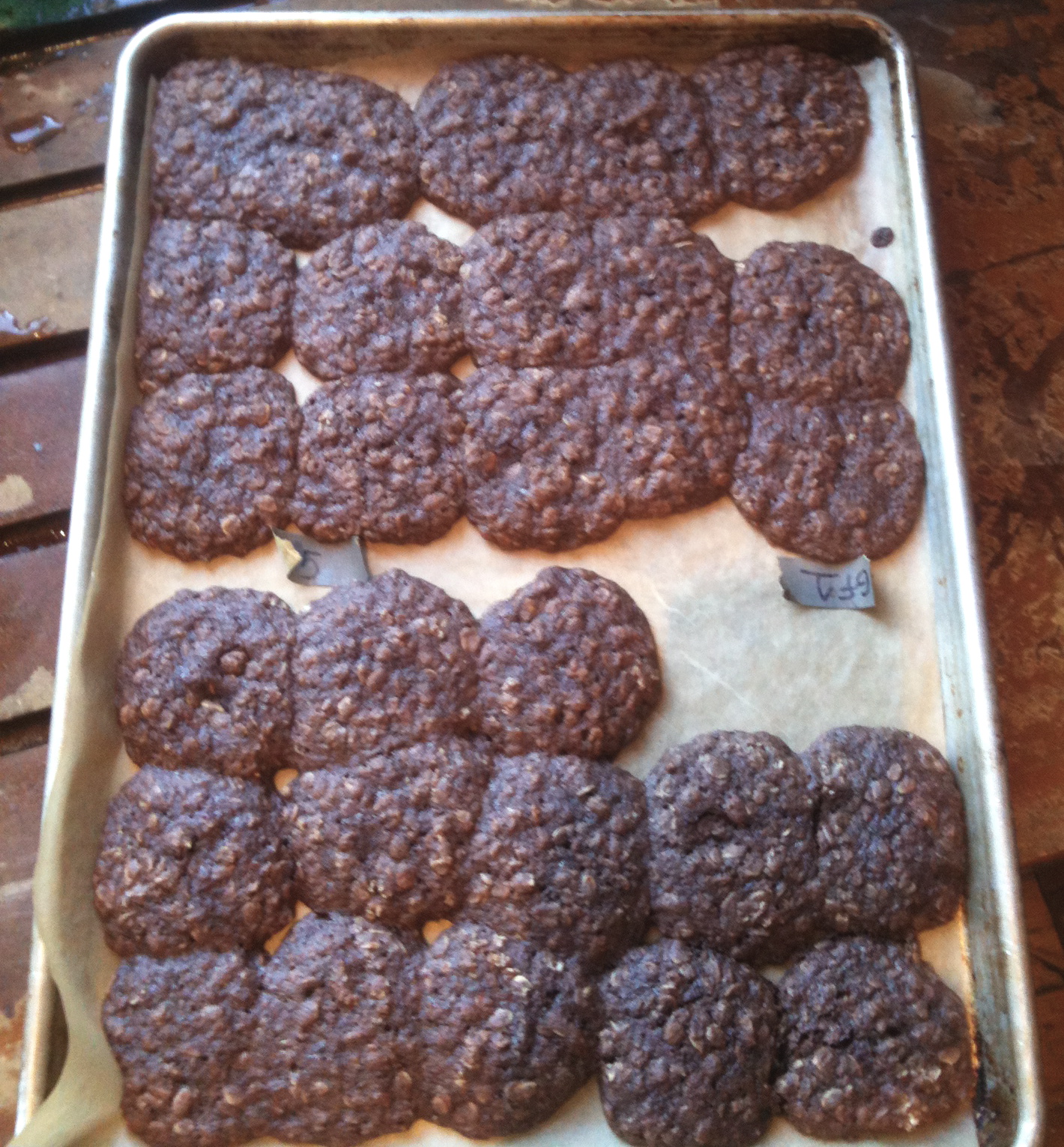 I figured it would be best to use a recipe I know really well, so I went with the base for my cocoa oatmeal cookies, and it all looked fine, right up to going into the oven. Then shit went downhill and fast.